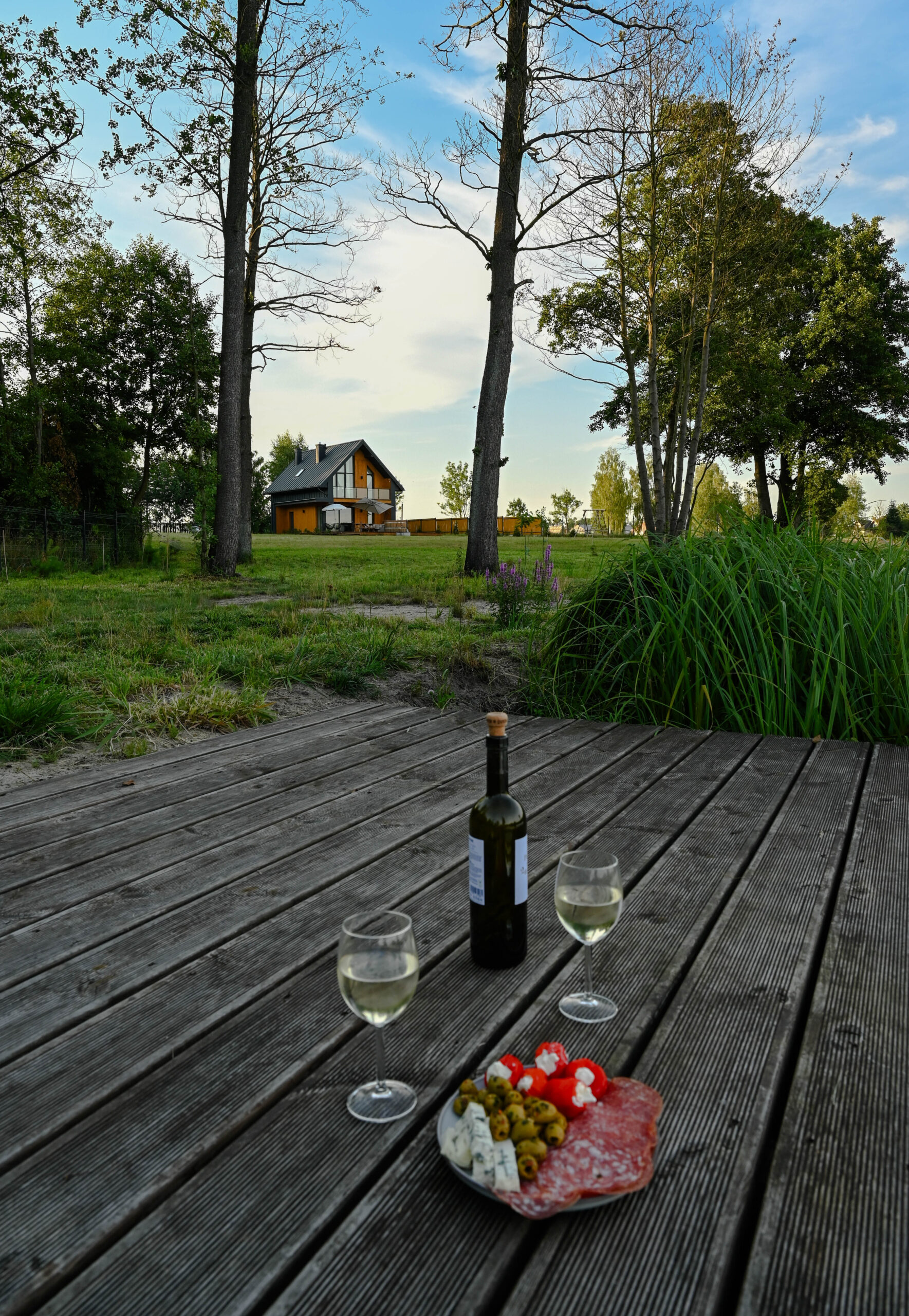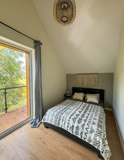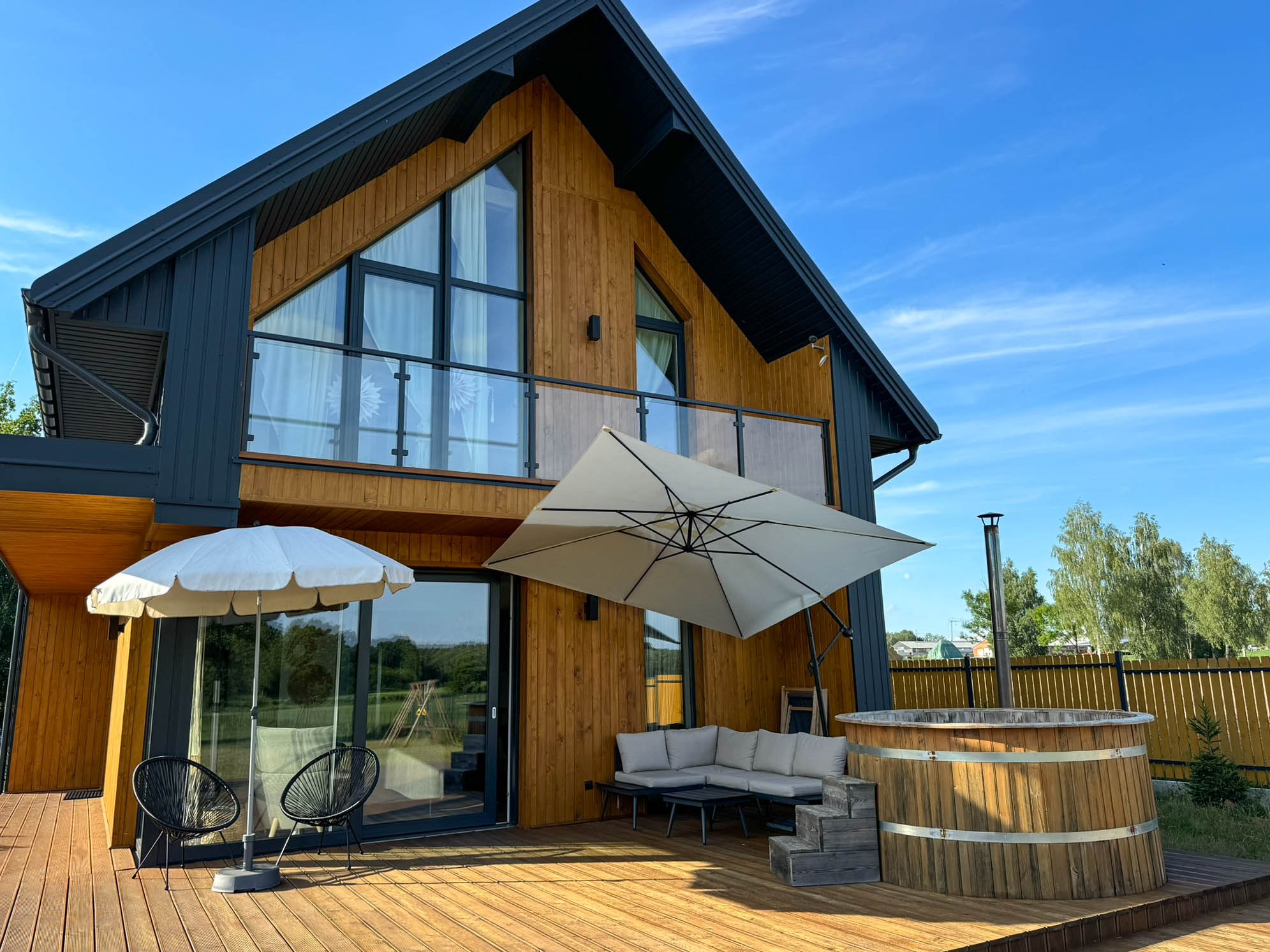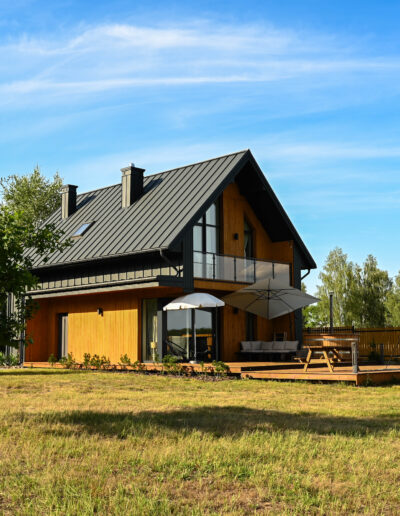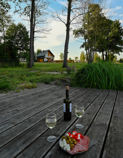 Przed domem rozpościera się duży, drewniany taras z paleniskiem, który stanowi doskonałe miejsce do wypoczynku i letniego jedzenia posiłków i wieczornych spotkań przy ogniu. Na tarasie znajdują się wygodne leżaki, na których można się zrelaksować, ciesząc się słońcem lub wieczornym chłodem. Dzięki temu taras staje się sercem letnich spotkań, zapewniając przytulne i funkcjonalne miejsce do spędzania czasu z rodziną i przyjaciółmi.