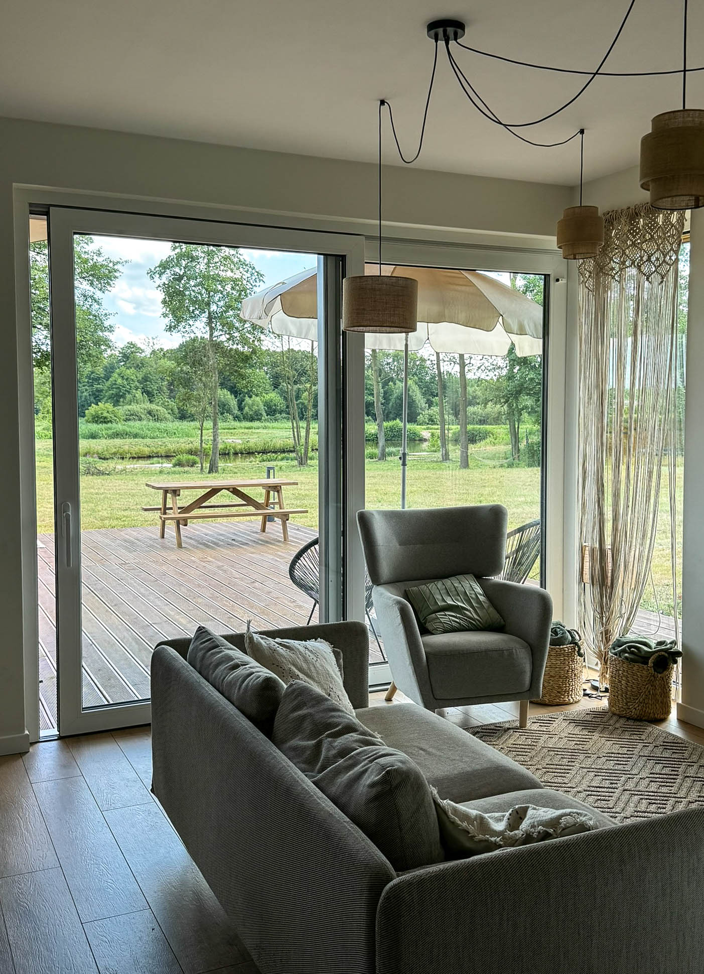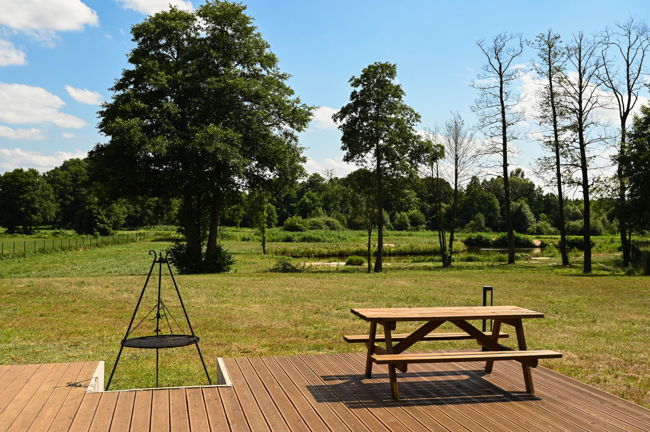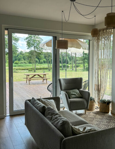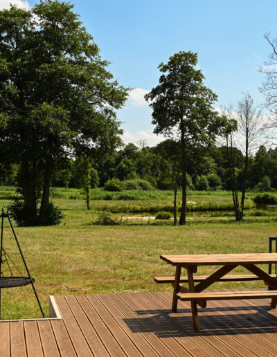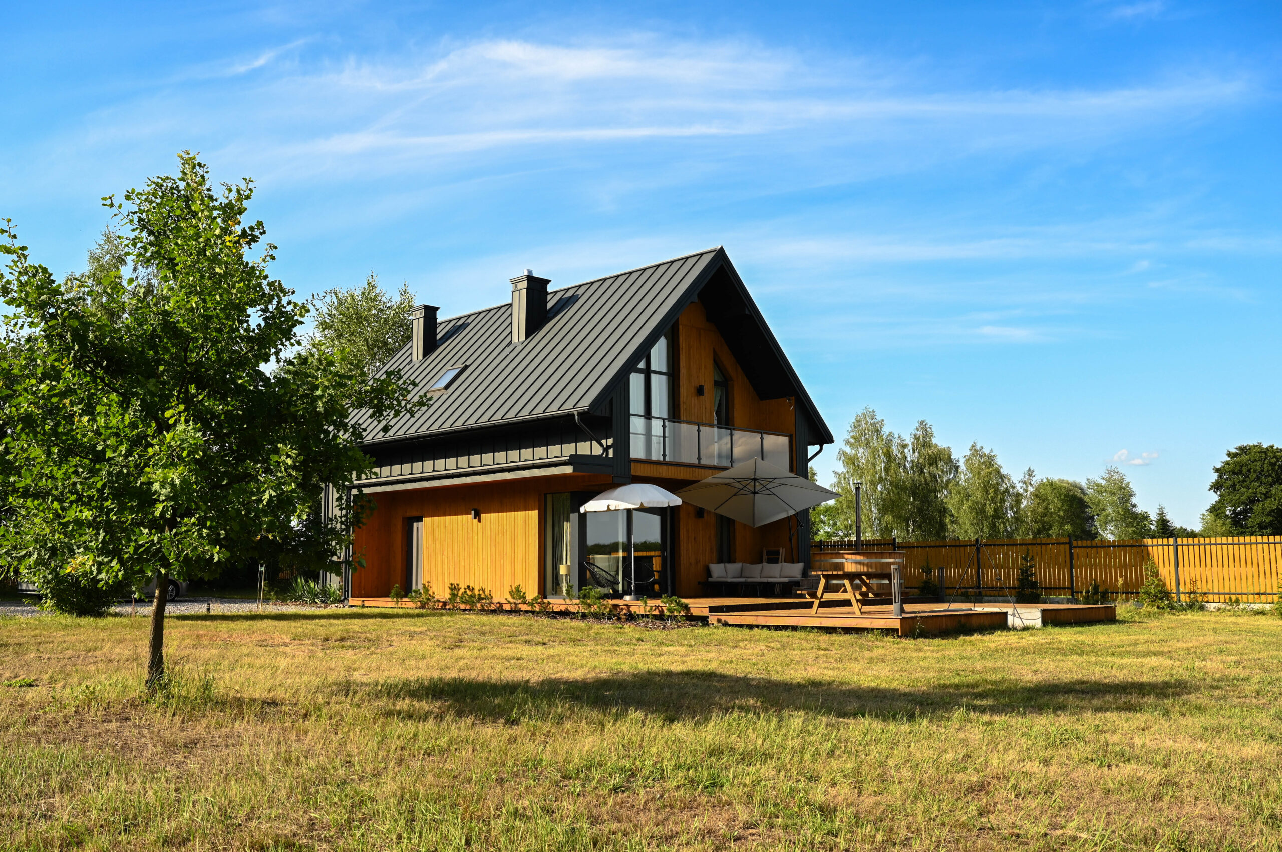 Przed domem rozpościera się duży, drewniany taras z paleniskiem, który stanowi doskonałe miejsce do wypoczynku i letniego jedzenia posiłków i wieczornych spotkań przy ogniu. Na tarasie znajdują się wygodne leżaki, na których można się zrelaksować, ciesząc się słońcem lub wieczornym chłodem. Dzięki temu taras staje się sercem letnich spotkań, zapewniając przytulne i funkcjonalne miejsce do spędzania czasu z rodziną i przyjaciółmi.